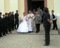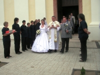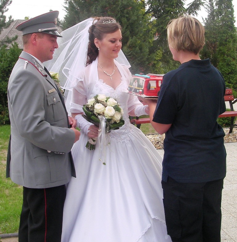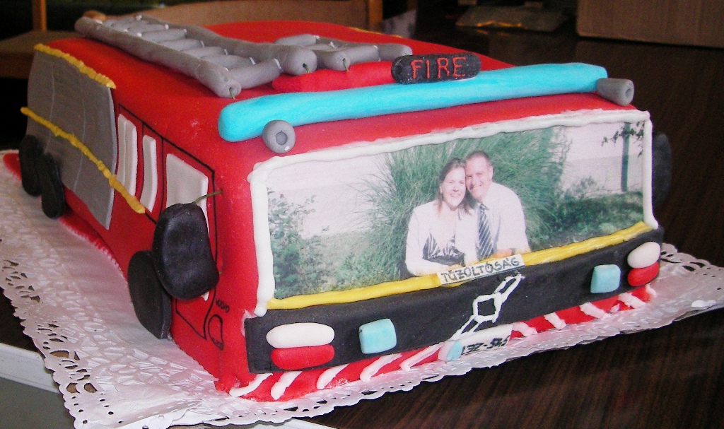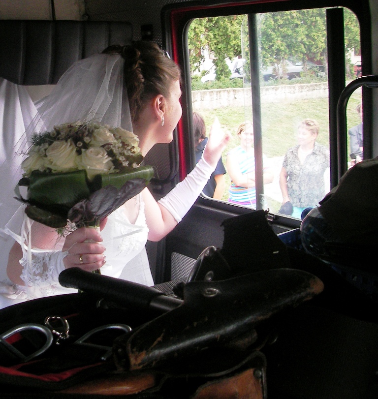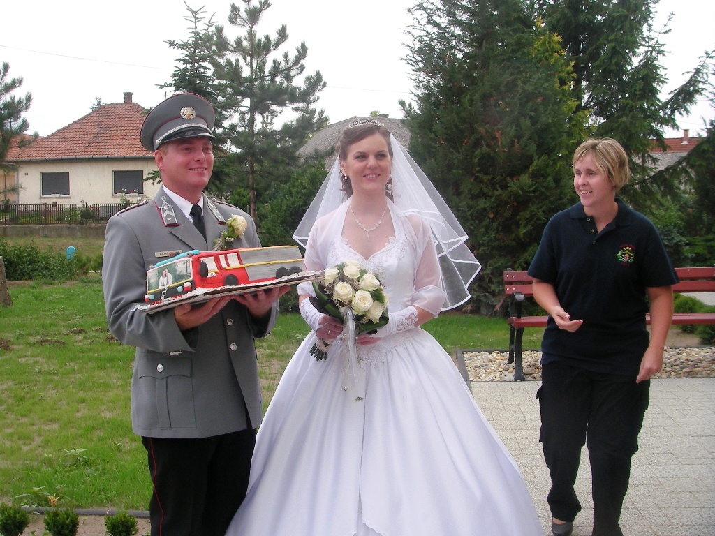A templomi szertarts utn sorfallal s egy tortval fogadtuk az ifj prt. A menyasszonyi aut pedig nem is lehetett volna ms, mint a kkai fecskend.